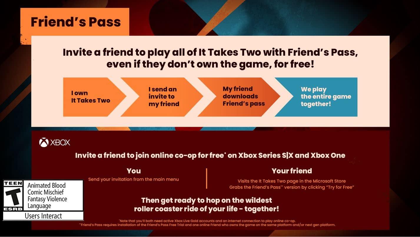 Embark on the craziest journey of your life in it takes two, a genre-bending platform adventure created purely for co-op. Invite a friend to join for free with friend's Pass and work together across a huge variety of gleefully disruptive gameplay challenges. Play as the clashing couple cody and may, two humans turned into dolls by a magic Spell. Together, trapped in a fantastical world where the unpredictable hides around every corner, they are reluctantly challenged with saving their fractured relationship. Master unique and connected character abilities in every new level. Help each other across an abundance of unexpected obstacles and laugh-out-loud moments. Kick gangster squirrels' Furry Tails, pilot a pair of underpants, DJ a buzzing night Club, and bobsleigh through a magical snow globe. Embrace a heartfelt and hilarious story, where narrative and gameplay are interwoven in a uniquely metaphorical experience. It takes two is developed by the award-winning studio hazelight, the industry-leader of cooperative play. They are about to take you on a wild and wondrous ride where only one thing is for certain: we're better together.