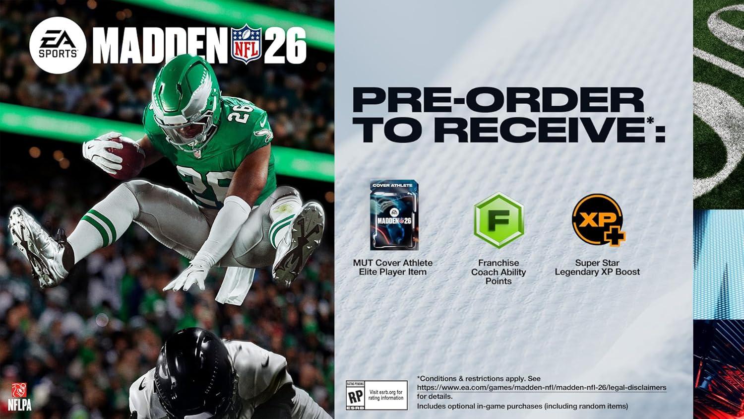 Pre-purchase* EA SPORTS Madden NFL 26 today and receive: MUT Cover Athlete Elite Player Item, Franchise Coach Ability Points, Super Star Legendary XP Boost