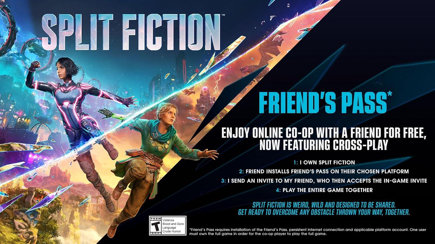 Embrace mind-blowing moments as you’re pulled deep into the many worlds of Split Fiction, a boundary-pushing co-op action adventure from the studio behind 2021 Game of the Year Winner It Takes Two. Mio and Zoe are contrasting writers – one writes sci-fi and the other writes fantasy – who become trapped in their own stories after being hooked up to a machine designed to steal their creative ideas. They’ll have to rely on each other to break free with their memories in-tact, working together to master a variety of abilities and overcome diverse challenges while jumping between sci-fi and fantasy worlds in this unexpected tale of friendship. Split Fiction is a unique action-adventure experience that keeps you on the edge of your couch with unexpected moments. One minute you’re taming adorable dragons and the next you’re fighting as cyber ninjas, escaping terrifying trolls, or dodging hover cars thrown by a robotic parking attendant. It’s weird, it’s wild, and it’s designed to be shared. Grab a friend and get ready to overcome any obstacle thrown your way.